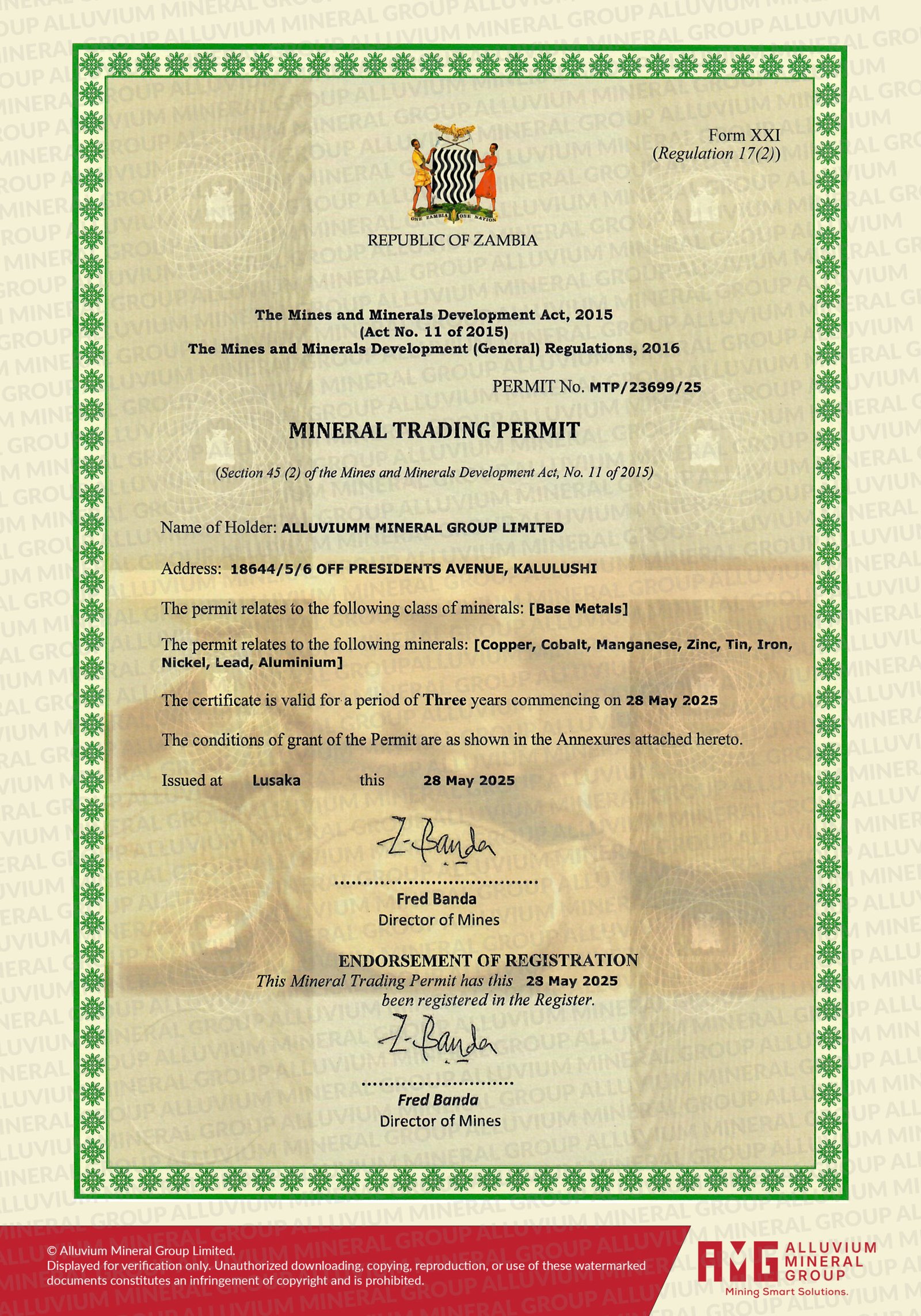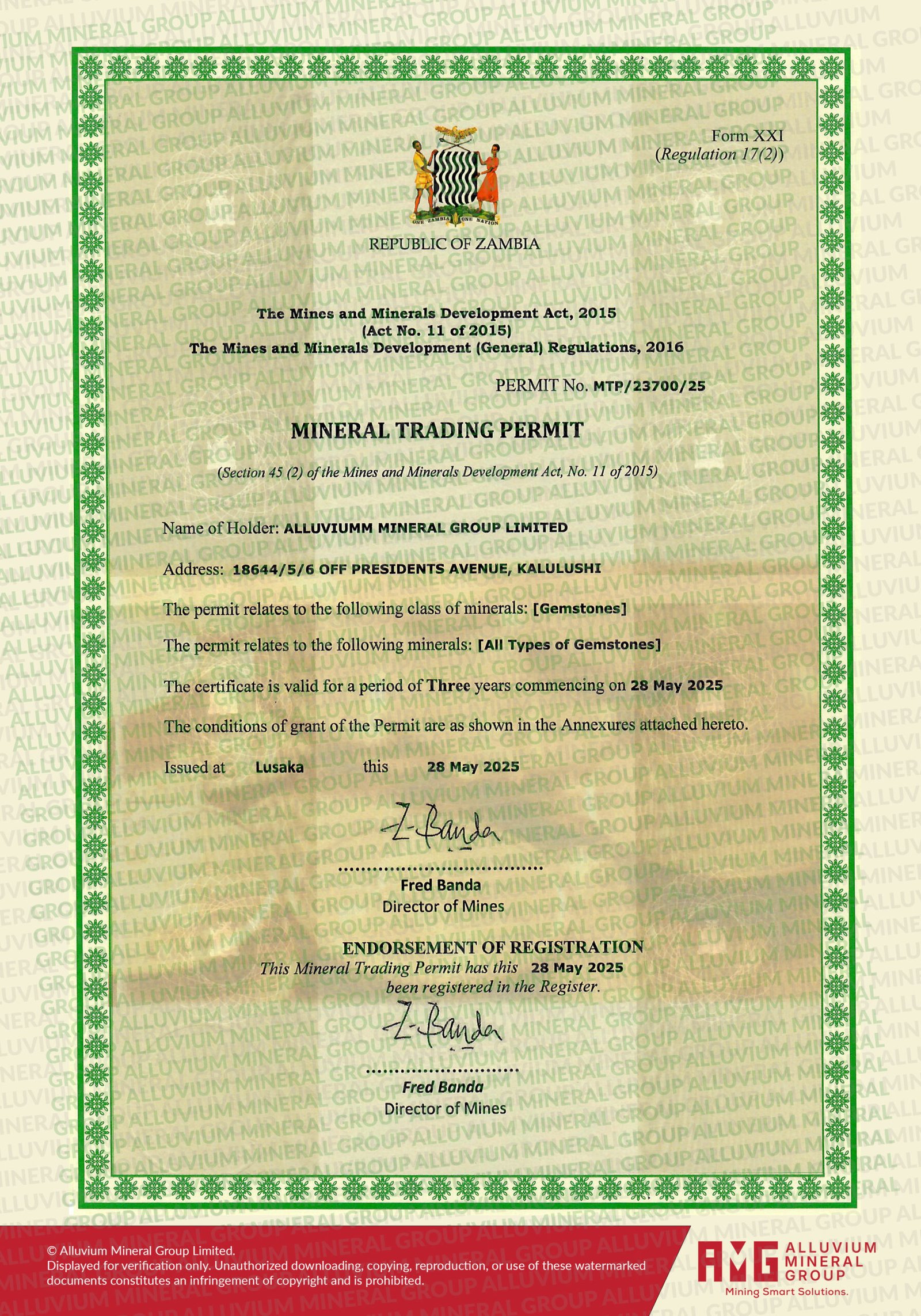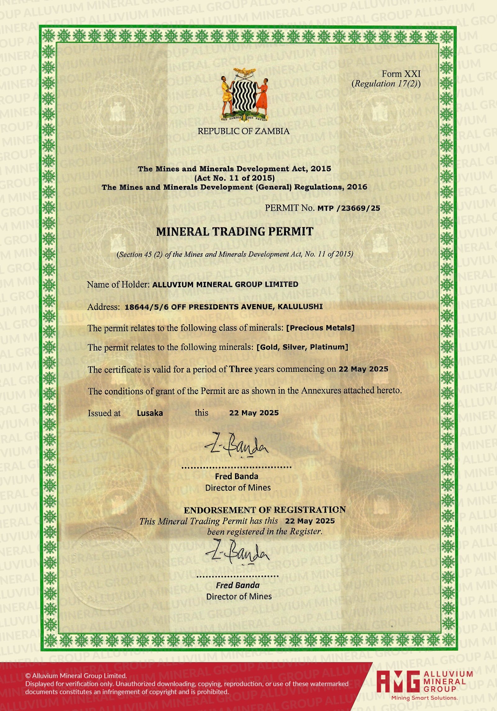 Resources & DownloadsStay ahead with industry commentary, licensing updates, and export tips. AMG DocumentsAMG Tax Clearance CertificateAMG Tax Clearance Certificate AMG DocumentsAMG Certificate of Share CapitalAMG Certificate of Share Capital AMG DocumentsAMG Certificate of IncorporationAMG Certificate of Incorporation AMG DocumentsAMG Business LevyAMG Business Levy AMG DocumentsAMG Mineral Trading Permits GemstonesAMG Mineral Trading Permits Gemstones AMG DocumentsAMG Mineral Trading Permits Base MetalsAMG Mineral Trading Permits Base Metals AMG DocumentsMineral Trading Permits Precious MetalsMineral Trading Permits Precious MetalsBrowse by Category AMG DocumentsOfficial company-issued resources Public DocumentsGeneral access templates and forms, Legislation, Statutory Instruments PublicationsIndustry guides, regulatory checklists and market intelligence Training & Capacity Building ResourcesSlide decks, toolkits, and onboarding materials